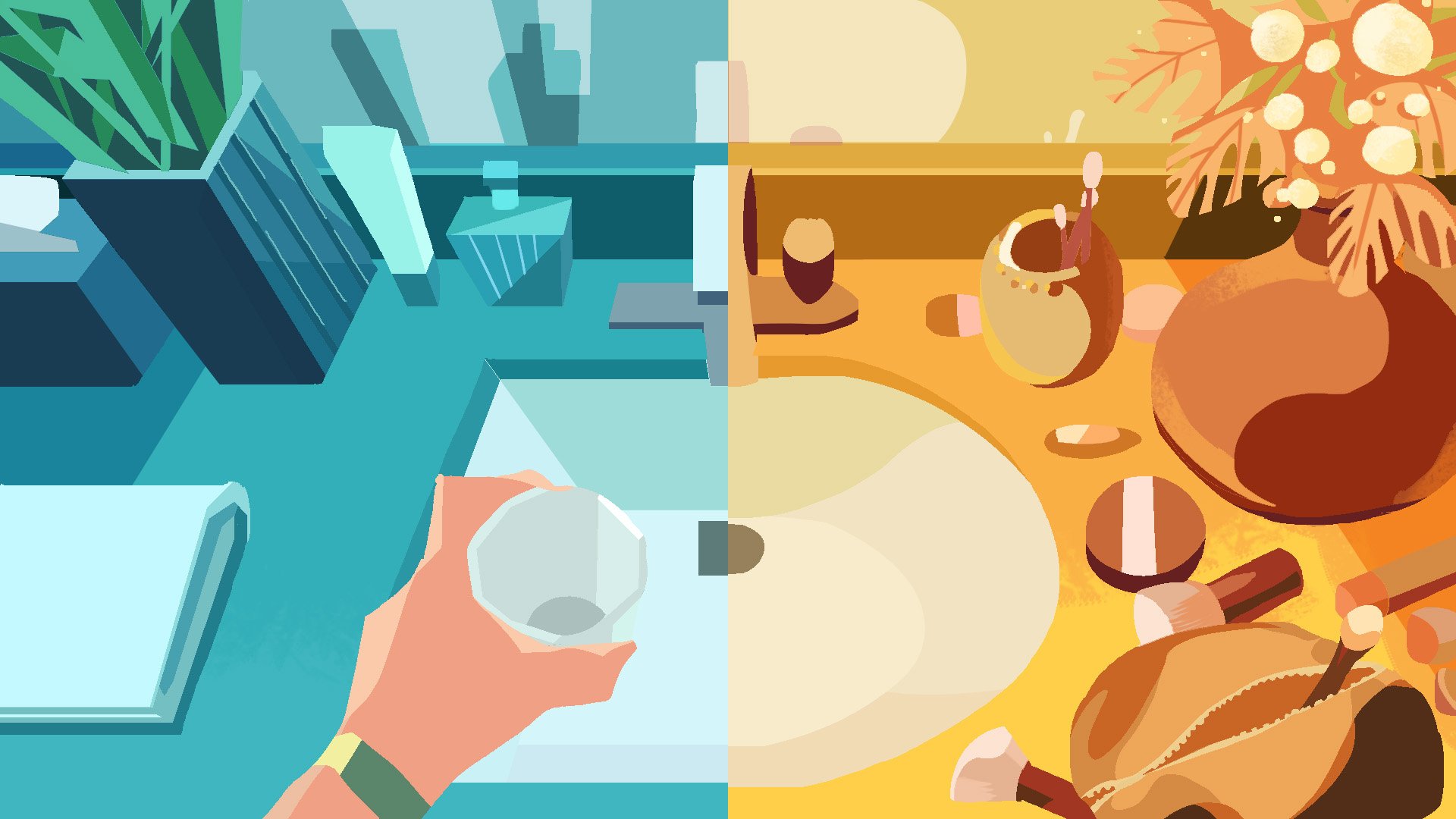 这个作品是为了支持我的毕设论题 - 平行蒙太奇:多线叙事的视觉呈现 而设计的动画短片。在取景的选择上,除了第一个镜头和最后两个镜头是客观镜头之外其余镜头都是第一视角的主观镜头。为了将2D逐帧动画和3D背景在美术风格上和谐共处,我刻意选择了大的,明艳的几何色块来作为短片的主要视觉风格。颜色,物件形状和镜头运动的差异皆旨在体现两个主角的性格习惯差异。